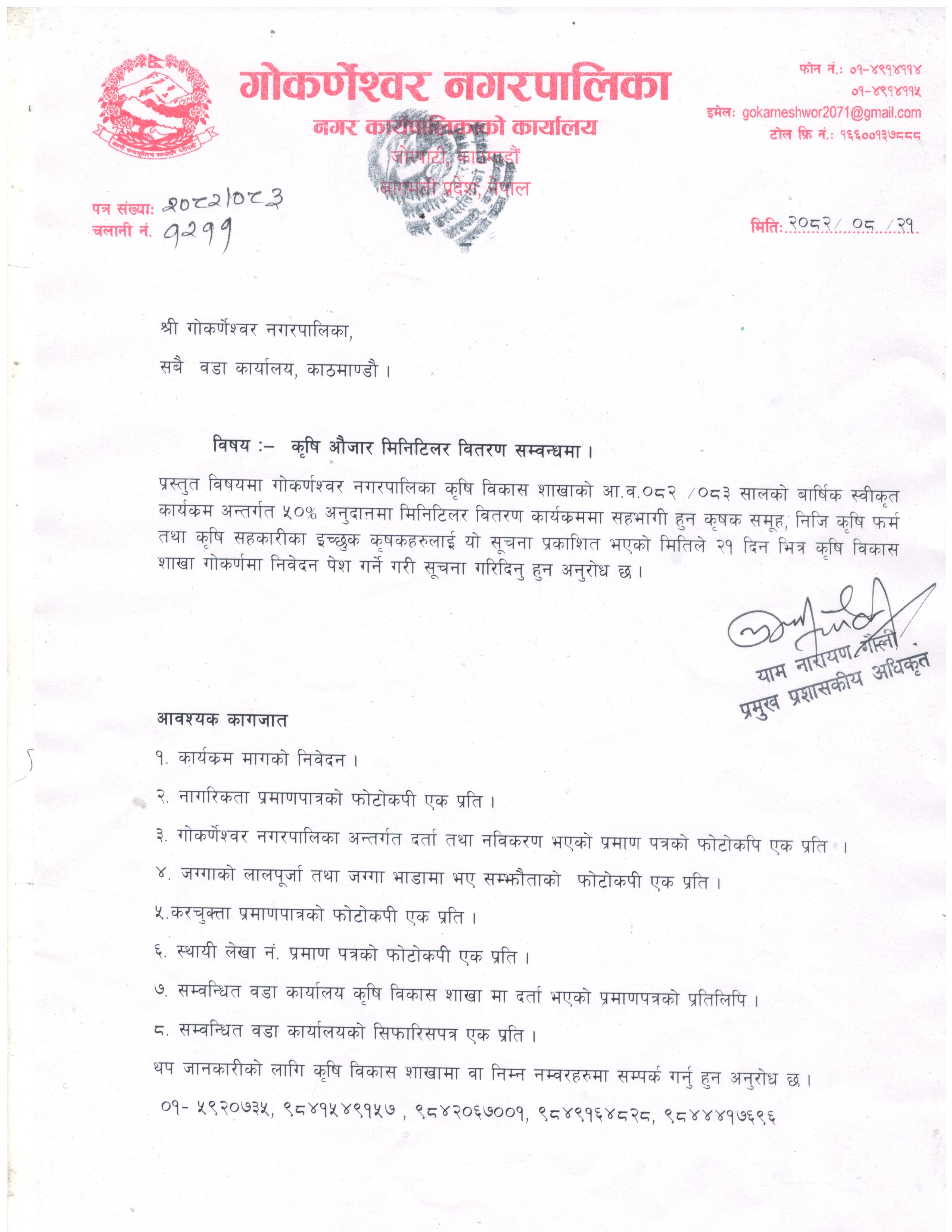 कृषि औजार मिनिटिलर वितरण सम्बन्धी सूचना ।